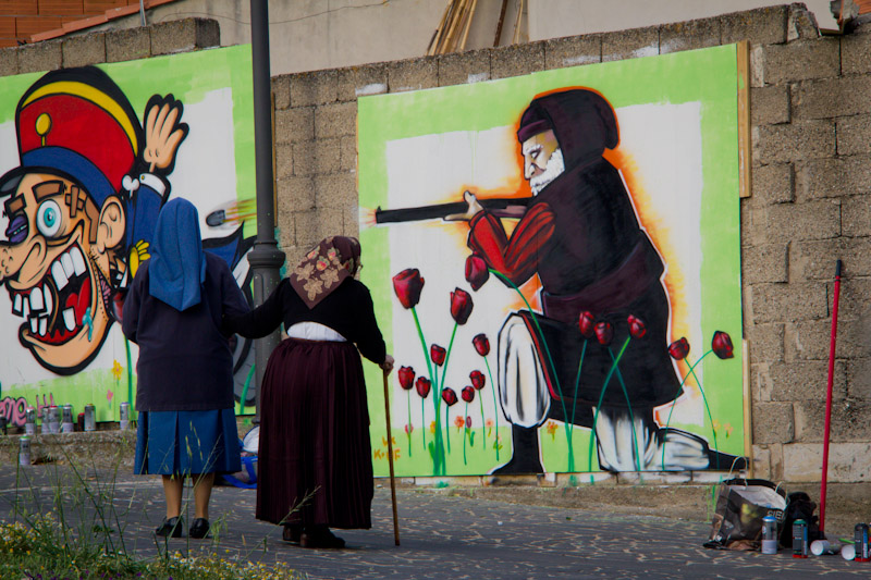 Riusciamo ad oltrepassare questa coltre di tensione calcistica e ci inoltriamo nella piazza, dove si terrà la manifestazione. L’atmosfera è da Far West, non tanto per l’ambientazione, quanto per il caldo asfissiante che si accalca terribilmente su di noi. Vedo gomitoli di sterpi rotolare nelle strade. Mi asciugo il sudore e mi giro a scrutare i miei coraggiosi compagni. Sembra stiano bene, possiamo proseguire per il cammino.