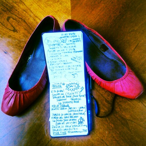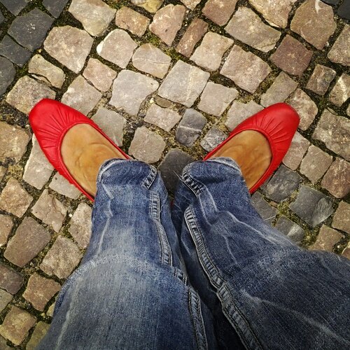 Lo so, vi fa ridere. Io non rido, anzi odio la vostra ilaritá gratuita, quella che vi spinge a calpestare i miei sentimenti e a considerarmi una povera donna (fuori patria fra l’altro) da schernire impunemente. A mia discolpa posso assicurarvi che io odio le ballerine, le ho sempre trovate insulse, ridicole, responsabili della piú becera squalificazione dei piedi femminili, almeno dei miei. Comunque qui non esiste donna che non ne abbia un paio e sembrano quasi essere caratterizzanti della moda femminile ceca, per cui finisce che divento pure trendy. La scelta del colore non é voluta, erano le uniche che sembravano starmi bene nell’Outlet in cui mi hanno indirizzato. Peccato che non siano costate due lire, ma preferisco non pensarci. Prometto di buttarle dalla finestra appena arrivata in patria, o anche prima visto che hanno il tacchetto rumoroso, mi stanno grandi (ho dovuto mettere un supporto di cui non rivelerò la natura) e poi non sono nel mio stile, che fa schifo lo so, ma comunque non le contempla.