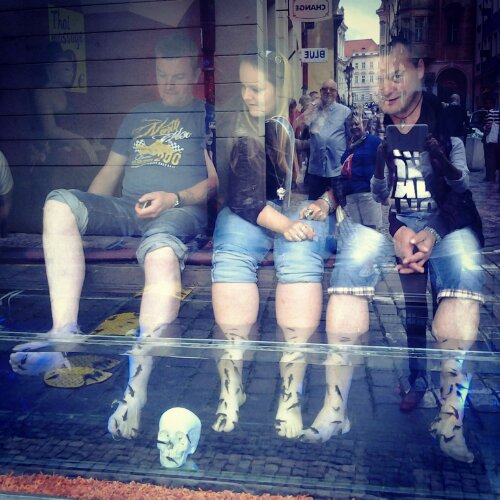 Me ne vado via dopo un bel po’ e risalgo ancora per la via Mosteckà. Mi imbatto in un Thai Massage. Stavolta in vetrina ci sono tre clienti che si fanno mangiucchiare la pelle morta degli arti inferiori dai pescetti carnivori. Mi fa impressione ed un po’ schifo, lo ammetto.