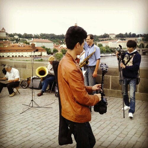 Mentre passeggio con le mie magiche scarpette, vengo incuriosita da un giapponese che ha un sussulto. Munito di quello che mi sembra un teleobiettivo, fa cenno agli amici come se avesse visto qualcosa di stupefacente ed incredibile. Poi però mi viene da ridere perchè il suo soggetto é il cane di in ragazzo che chiede l’elemosina. Il grosso animale (semplicemente) dorme. E io che pensavo parlasse, almeno quello mi sarei aspettata dalla sua reazione. Nel ponte noto con estremo divertimento anche altri giapponesi dallo stesso curioso comportamento nei riguardi di ogni artista di strada che incontrano. Alcuni si son portati il treppiede, altri riprendono tipo regista facendo carrellate con macchine che neanche Tarantino in Kill Bill… Tutto in presa diretta poi. Esagerati! Ma perché? Ma cosa ci vogliono fare? mi chiedo divertita. Rido (molto) e li immortalo (ovviamente).