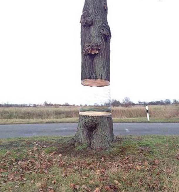 Il risultato è l’illusione che l’albero sia tagliato a metà e che si regga sul niente.