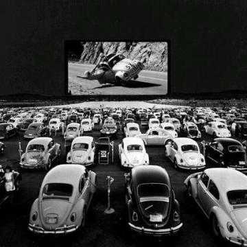 Volkswagen Beetle guardano ‘Herbie – The Love Bug’ in un teatro drive-in, c. 1960
