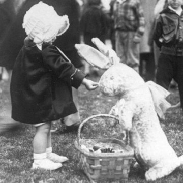 Una bambina dà caramelle a un coniglietto pasquale 1929
