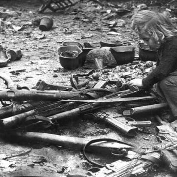 Bambini che giocano con le armi lasciate per le strade di Berlino, 1945
