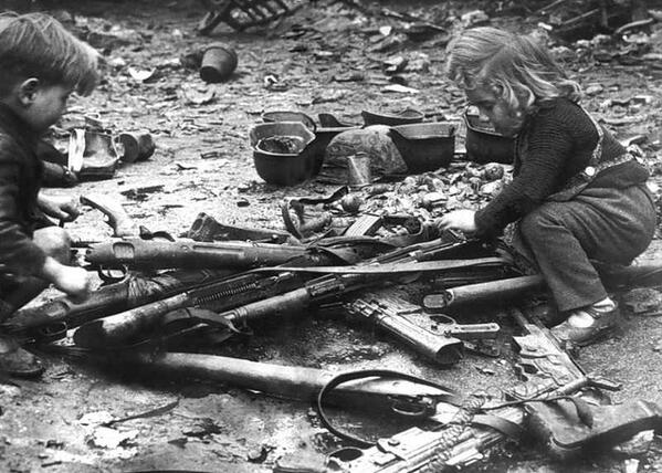 Bambini che giocano con le armi lasciate per le strade di Berlino, 1945
