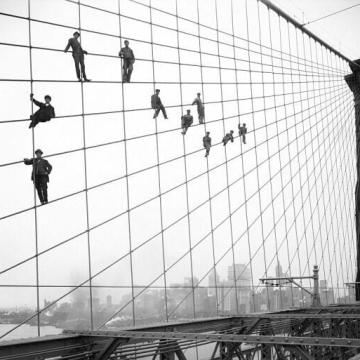 Pittori sui cavi del ponte di Brooklyn, 7 ottobre 1914. Fotografia di Eugene de Salignac
