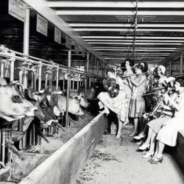 Una banda musicale fa la serenata alle mucche per verificare scientificamente se la musica influenza la quantità di latte, 1930