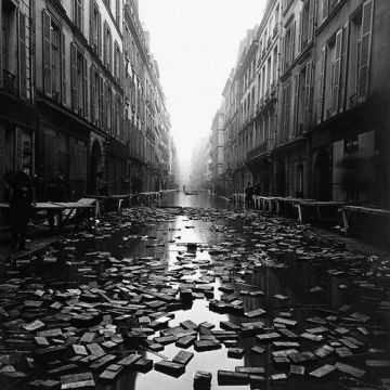 I libri galleggianti della biblioteca lungo una strada durante il Diluvio Universale di Parigi 1910