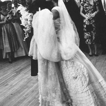 John F. Kennedy e Jacqueline Kennedy si abbracciano durante il primo ballo al loro matrimonio a New Port, Rhode Island