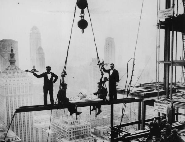 Due camerieri servono il pranzo a due operai su una trave sopra New York City, 1930 (Foto di Keystone: Getty Images)