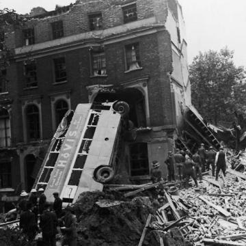 Il relitto di un autobus che è stato fatto scontrare contro una casa a Londra durante il Blitz, 9 set 1940