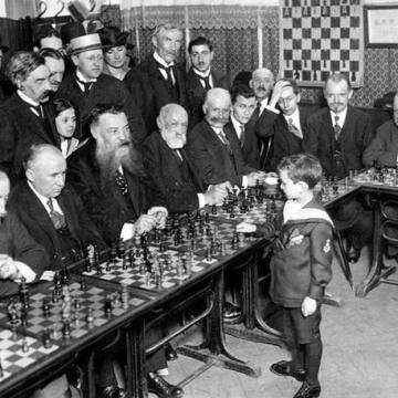 Il prodigio degli scacchi Samuel Reshevsky all’età di 8 anni sconfigge diversi maestri di scacchi in una sola volta in una sola volta nel 1920
