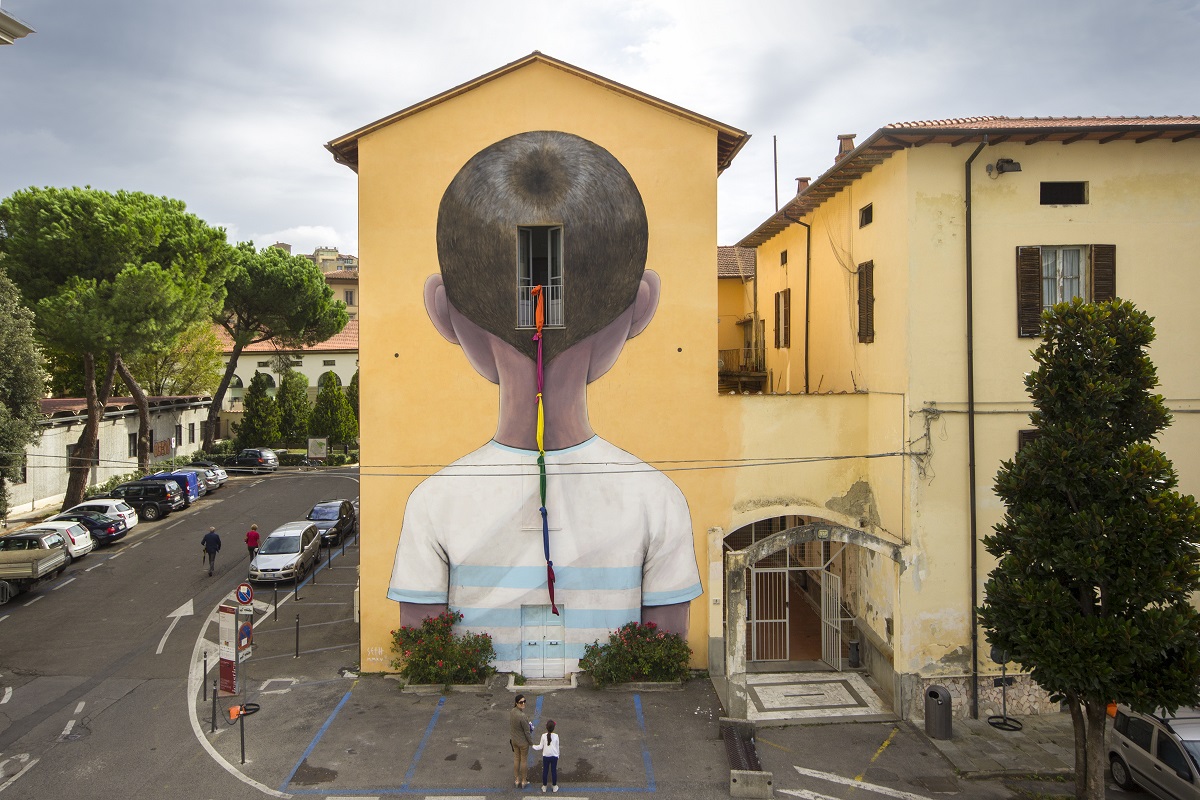 “Murale realizzato da Seth ad Arezzo, Italia per il Festival Icastica 2015. Creato utilizzando acrilico, spray e lenzuola annodate sulla parete.