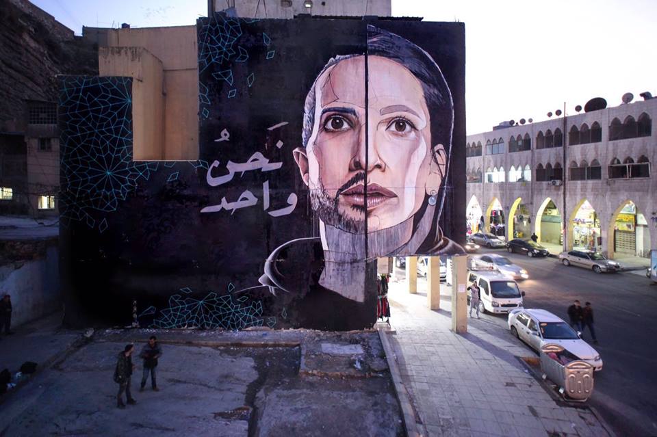 “Metà faccia di donna, metà di Kevin Ledo dipinto da AKUT di HERAKUT per la parità di genere nel centro di Amman, Giordania, sulla strada per l’anfiteatro romano.”