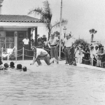 Un agente di polizia fuori servizio si getta in piscina per combattere con i rabbini presso la piscina del Monson Motor Lodge, 18 giugno 1964