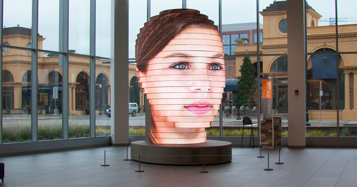 Si tratta di una grande struttura alta 14 piedi che ruota lentamente e, servendosi un database, mostra tutta la gamma di volti dei visitatori su 24 bande orizzontali di schermi a LED. Le immagini avvolgono a 360 gradi la struttura, con la sola eccezione di un punto in cui i visitatori possono immortalare il loro volto che sarà immediatamente proiettato. Un’installazione dunque interattiva che permette agli ospiti di interagire con l’arte pubblica.