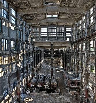 L’enorme sala della fabbrica chimica abbandonata di Rudersdorf, Berlino, Germania
