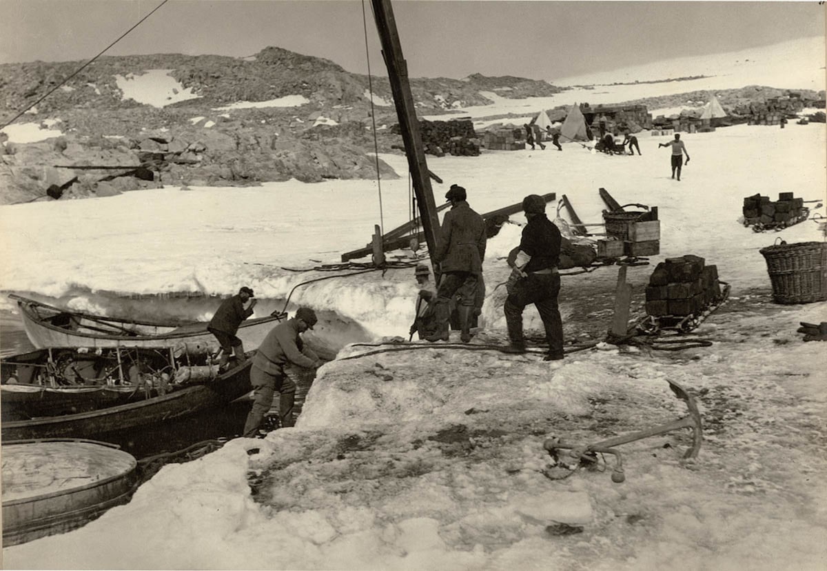 Scarico delle forniture a Cape Denison. Fotografia di Frank Hurley