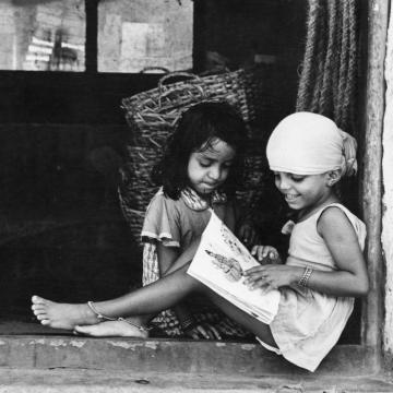 Museum number PHY.07748 T. S. Satyan, Homework after bath, 1978, H. 23.4 cm, W. 30.2 cm, Silver gelatin print