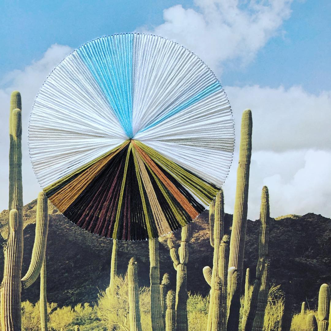 Natalie Ciccoricco è un’artista olandese trapiantata in California che basa il suo lavoro sul collage. Nelle sue opere cerchi radiali variopinti vengono ricamati su fotografie vintage. Questi cerchi rappresentano una sorta di campione di colore della fotografia in cui vengono installati, in quanto racchiudono tutte le tonalità in essa presenti. In ognuno di questi cerchi sono presenti, infatti, più di una dozzina di diverse tonalità di filo da ricamo che riprendono i colori sfumati presenti nelle immagini vintage.