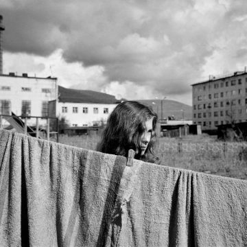 Russia, Magadan Region, Yagodnoe, 2014, Girl hangs laundry for drying.