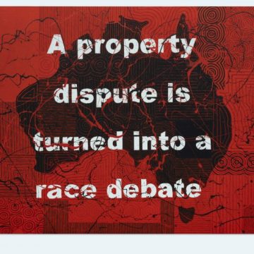 Richard Bell, A property dispute is turned into a race debate, 2019 acrylic on canvas 180 x 240 cm, courtesy l’artista e PAC