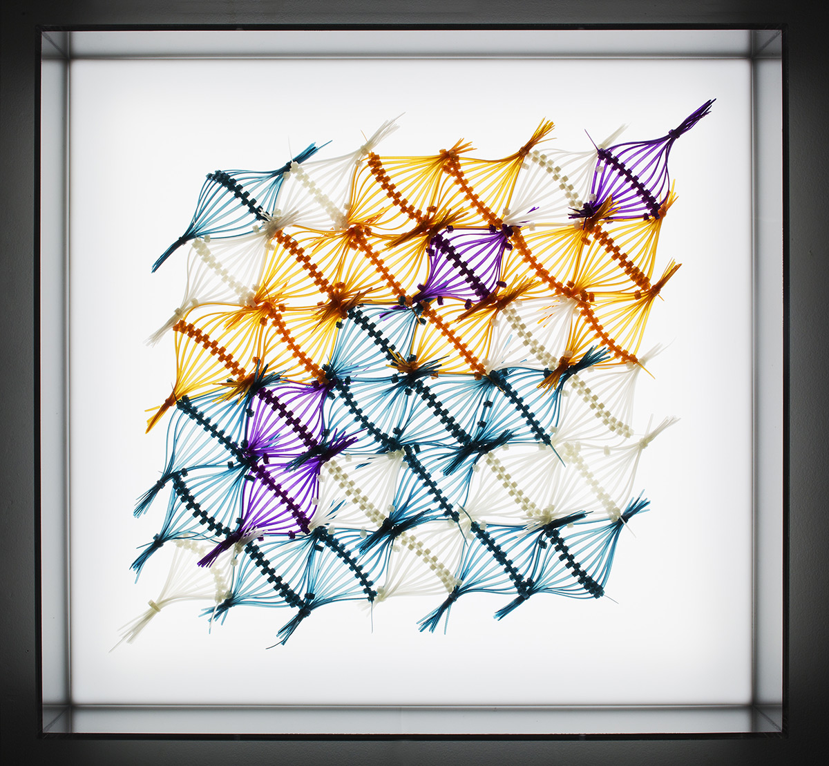 Elisabeth Picard. “Evolution” (2015), dyed zip-ties with plexi lightbox, 20.5 x 21.5 x 6 inches. Photo by Michel Dubreuil