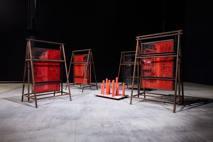 Chen Zhen, Le Rite suspendu / mouillé, 1991 Installation view, Pirelli HangarBicocca, Milan, 2020 © ADAGP, Paris Courtesy Pirelli HangarBicocca, Milan, and de Sarthe Gallery, Hong Kong Photo: Agostino Osio