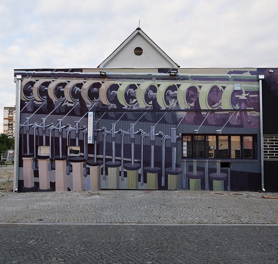 There were six distinctive phases of its transformation, each represented on the wall based on the different topic that we were given by the curator of the project Monika Ponjavić. Finding a way to visually connect these 6 images into one ongoing story was the biggest challenge. We decided to split the walls into two parts – “Life of the Factory – Glory and Ruin” on the left side and “Transition to creative hub” on the right side. Two walls that I have painted (1/6 and 4/6) were positioned on the left side of the building.”