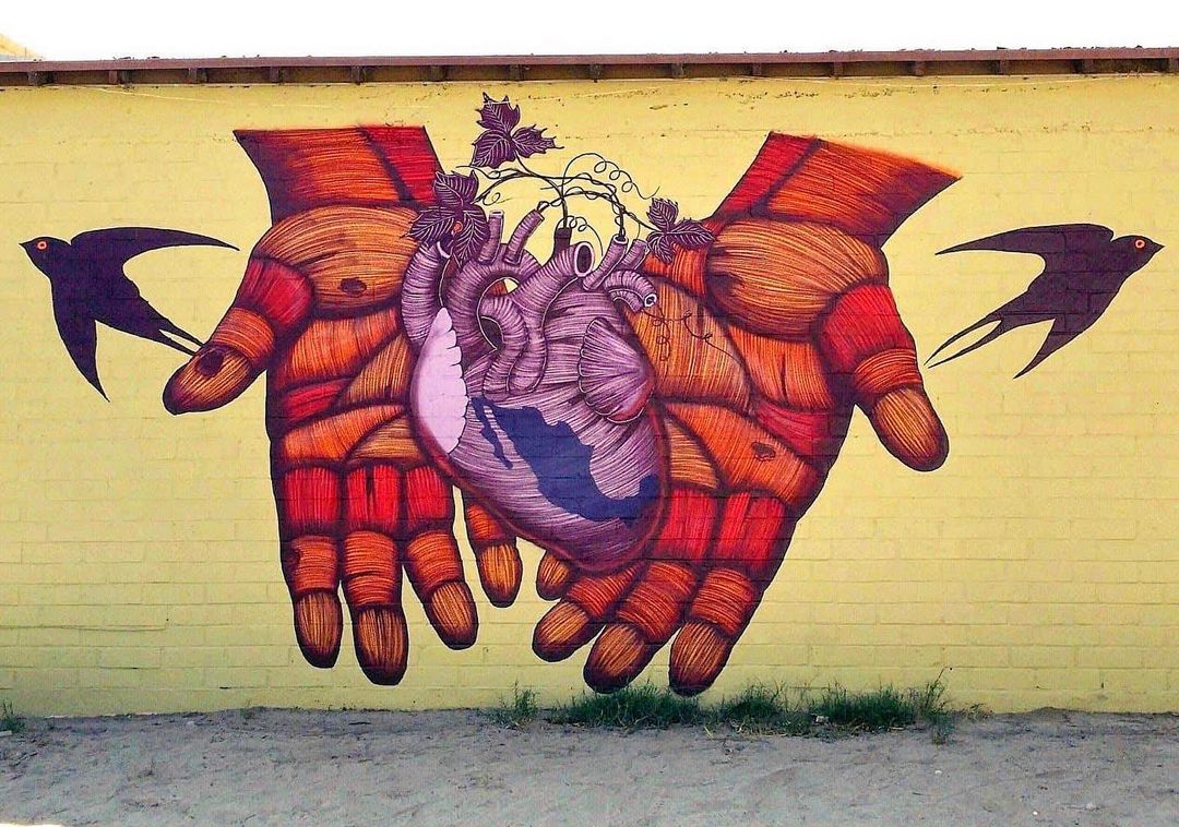 “En memoria de César Chavez y los trabajadores de las uvas 1927-1993. Las manos corriosas son de los campesinos que formaron está tierra, el corazón y hojas de uva representa a los campesinos que junto con César Chavez, decidieron hacer un paro que cambió la historia en cuanto a los derechos laborales de los campesinos, las golondrinas son aves migratorias que viven en esta región, y representan a los migrantes, en el corazón está tatuado México, representa el cariño y vínculo que tienen los migrantes y sus desendientes por el país, que aunque estén lejos lo llevan siempre en el corazón.”