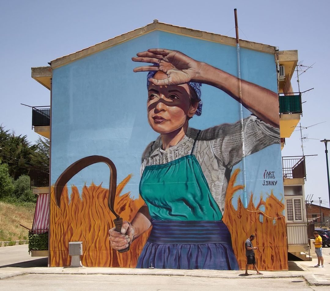 “Sicily was once considered the bread basket of Rome and this art is dedicated to the wheat cycle. In Prizzi Sicily, I was surprised at the extremities of climate; chilly and windy at night but with a blazing sun during the day. I imagined what it might have been like harvesting wheat in that relentless sun.”